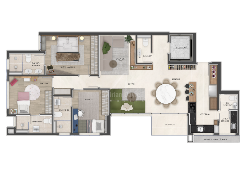 Apartamento com 3 suítes, sala para dois ambientes, lavabo, cozinha integrada e área de serviço.