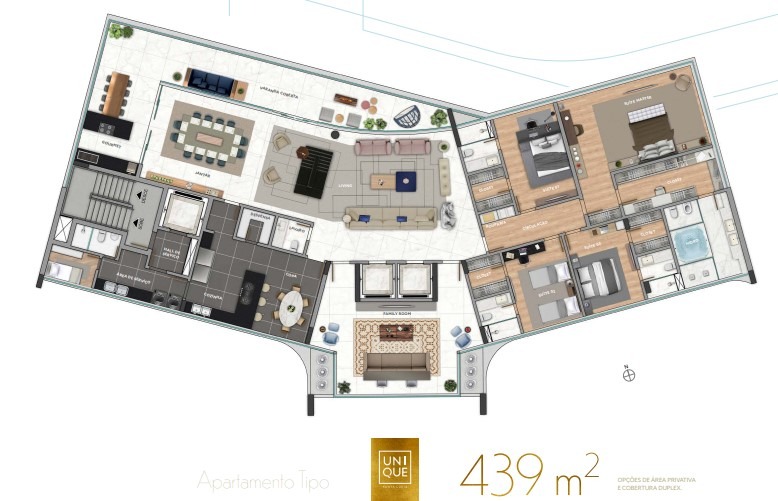 Área de 439m2, sala para 4 ambientes, 4 suítes com closet, sendo a master com hidro, lavabo, varanda gourmet panorâmica, rouparia, family room, copa, cozinha, despensa, área de serviço independente e DCE.