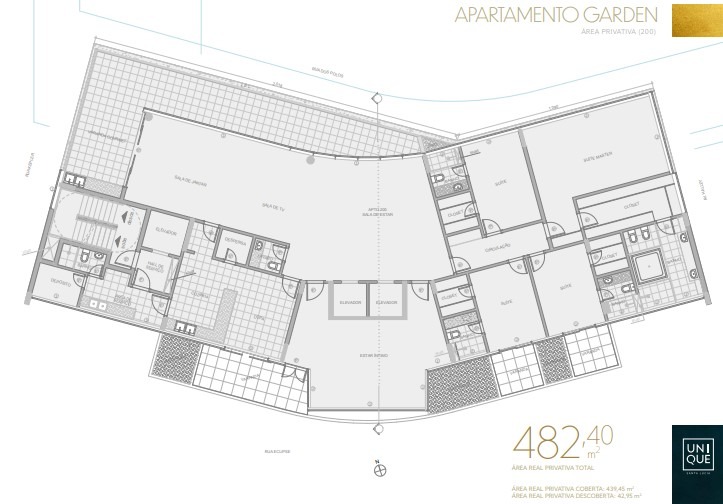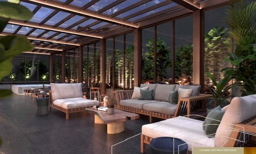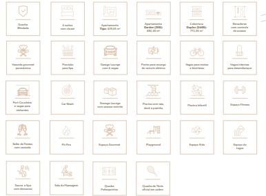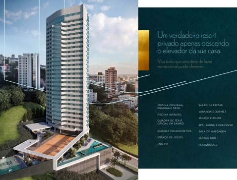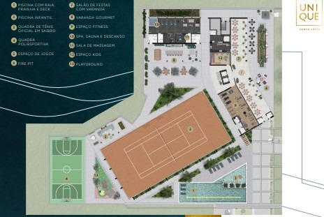 Localização privilegiada, alto luxo, 1 por andar, espaço gourmet, salão de festas com varanda, quadra de tênis oficial em saibro, quadra poliesportiva, sala de massagem, sauna e spa com área de descanso, espaço de jogos, espaço kids, playground, pit fire, piscina infantil, piscina com raia, deck e prainha, storage lounge com acesso exclusivo, port couchere e vagas para visitantes, car wash, vagas internas para desembarque, vagas para motos e bicicletas, pontos para recarga de carros elétricos, elevadores com controle de acesso, guarita blindada.