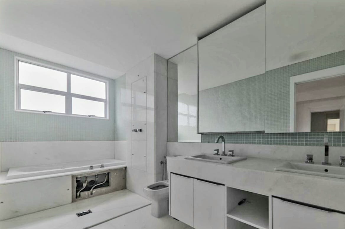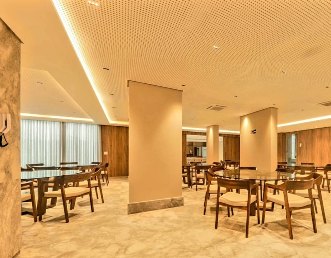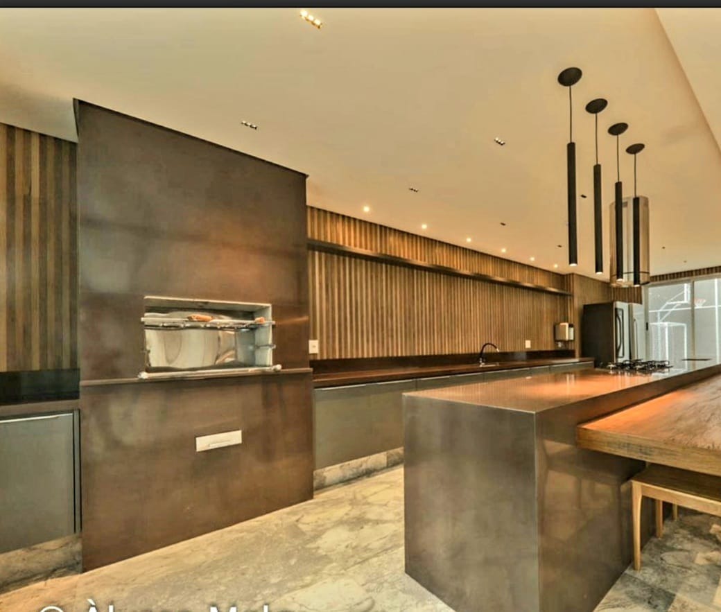 Apartamento com 281,56 m² ;área interna com 197,15 m² sala ampla, piso é porcelanato , Porto Belo. Varanda gourmet com 84,41 m² ; lavabo, 04 quartos piso laminado , com armários , sendo duas suites e um banho social, que serve a dois quartos ; piso dos quartos é laminado vinílico e partes frias em granito; box e espelhos nos banheiros, roupeiro, cozinha com bancada em granito , armários , despensa , área de serviço , DCE. . sistema acústico, espaço para adega. Estrutura para ar condicionado nos quartos e sala. As janelas dos quartos são do tipo duas folhas vidro e veneziana totalmente de embutir e tem controle remoto na veneziana.