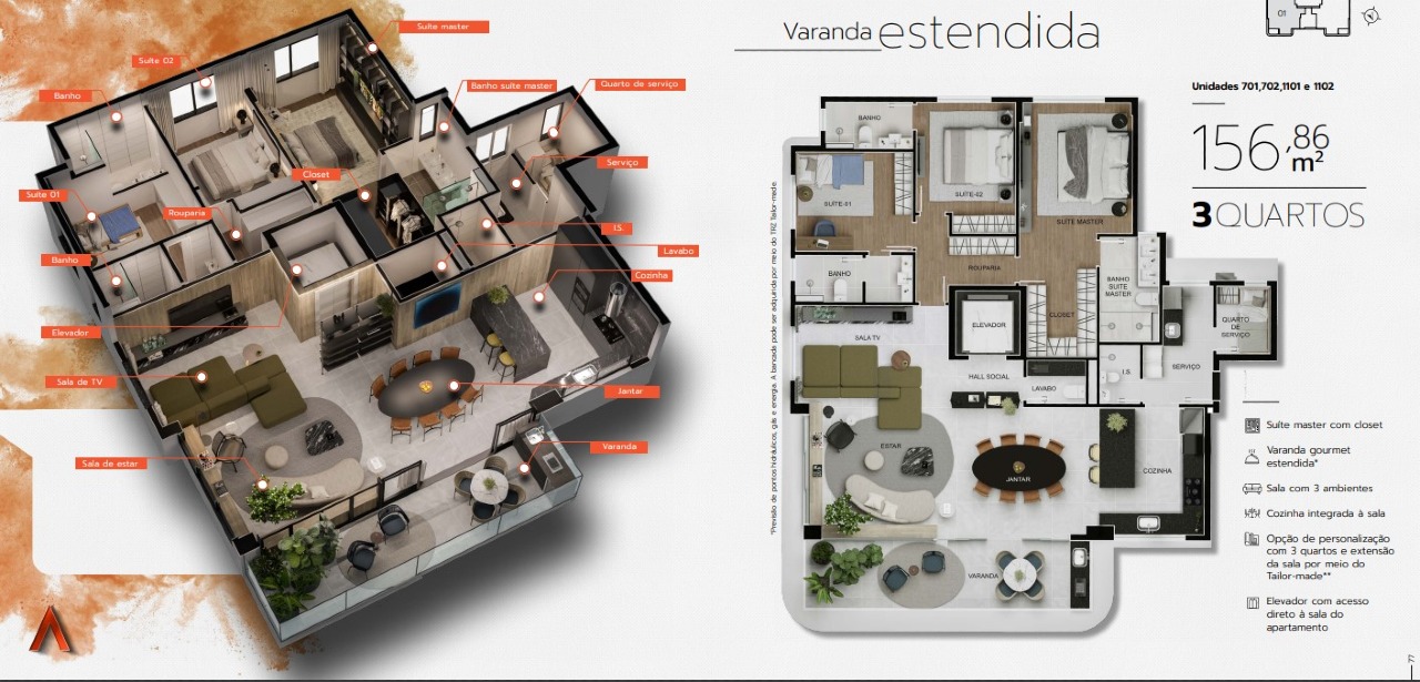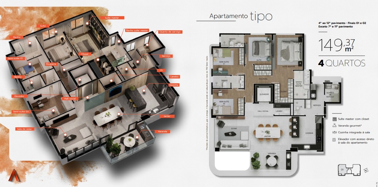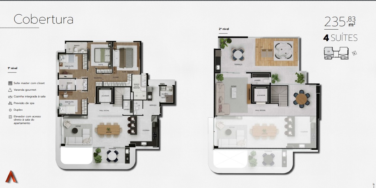 Apartamento com área total de 339,69m², sendo 190,32 m² de área descoberta com previsão para spa,hall privativo, sala ampla para 2 ambientes, lavabo, varanda gourmet, 4 quartos sendo 2 suítes, 2 semi suítes, suíte master com closet , cozinha integrada, área de serviço independente com DCE.