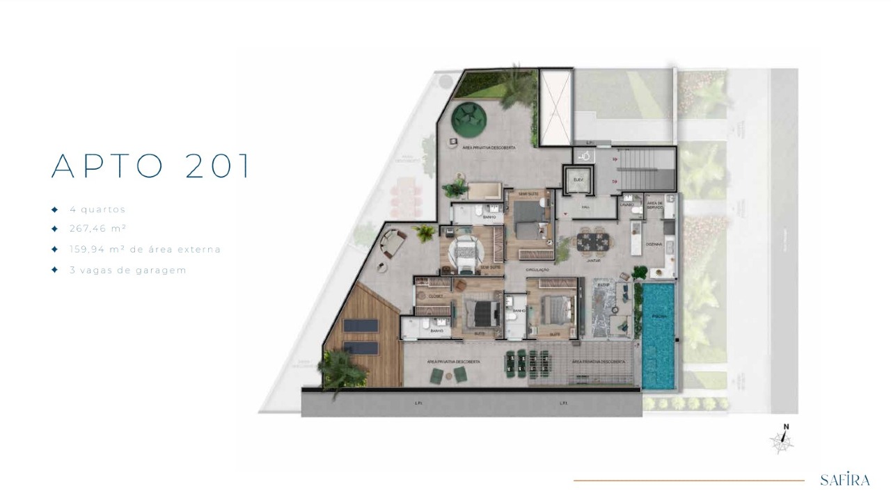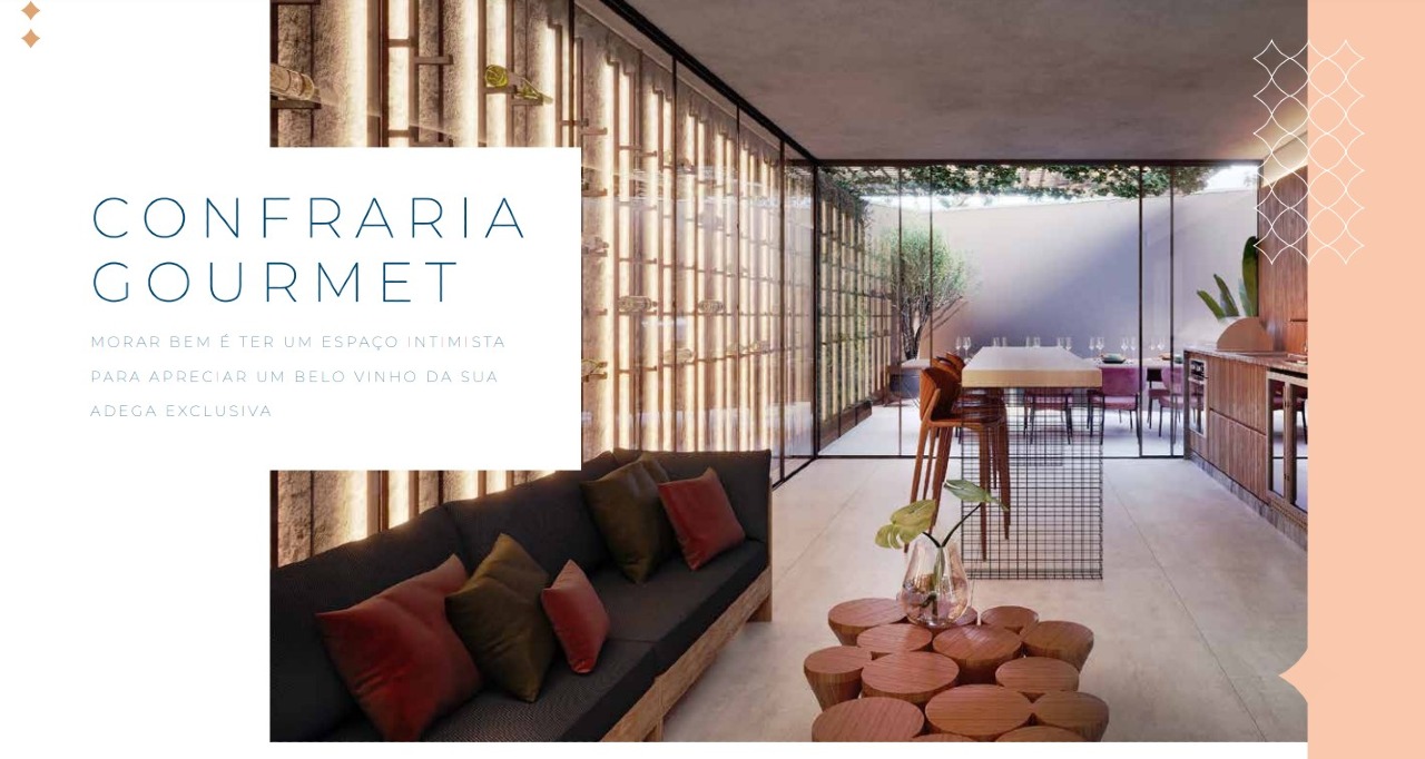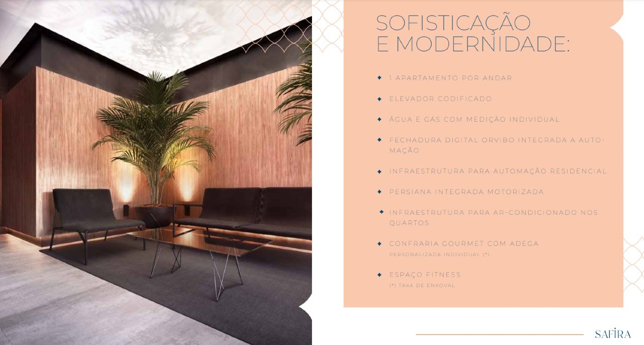 Benefícios: Elevador, piscina individualizada, confraria gourmet com adega, espaço fitness.