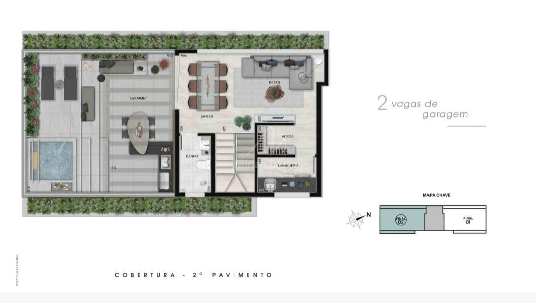 2º nível: sala de jantar/estar e adega; lavanderia; espaço gourmet; área livre.
