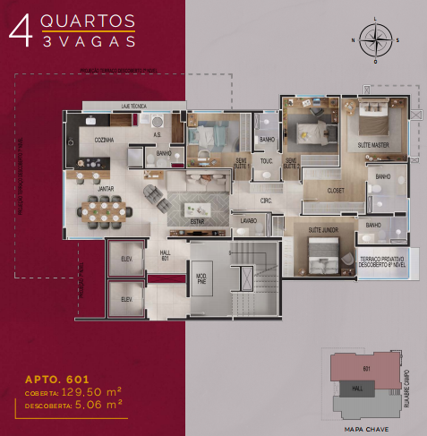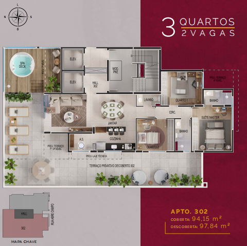 34,19m2 cobertos com sala, lavabo, churrasqueira e 61,34m2 descobertos com deck com SPA e terraço descoberto.