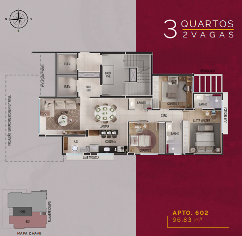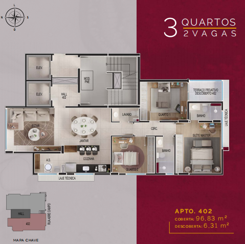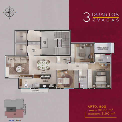 96m2 cobertos com sala para 2 ambientes integrada à cozinha,3 quartos sendo 1 suíte, banho social, área de serviço;