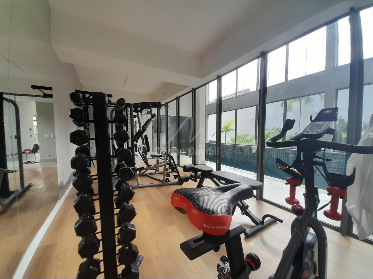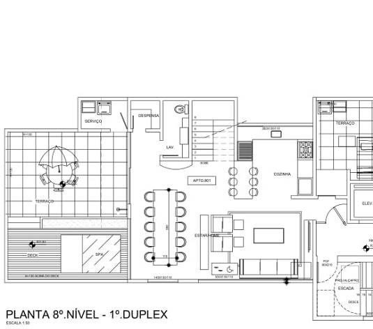 1° nível com 130m²: área interna com 80m²; sala ampla para 2 ambientes piso porcelanato; lavabo; cozinha americana com bancada em granito; área de serviço; terraço livre com 50m² com bancada gourmet.