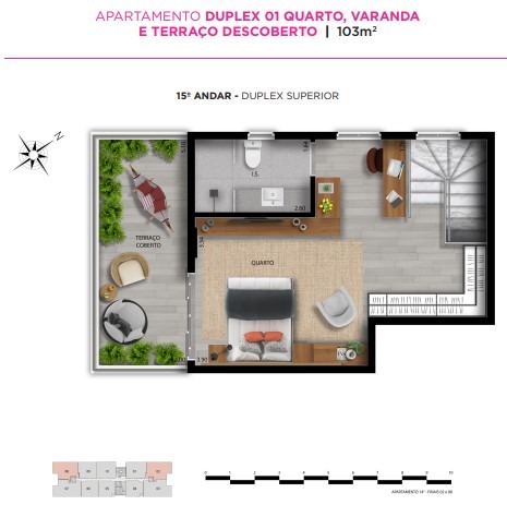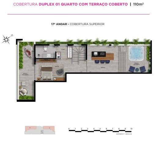 2º nível: 32,87m2 composto por 1 quarto, escritório, closet, banho social, varanda e 2 terraços descobertos.